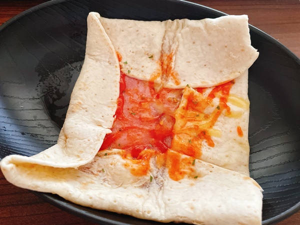 月曜日のお昼はブリトーを開いてガレット風にしたやつ。追加で好きなソース足して食べるのが好き。