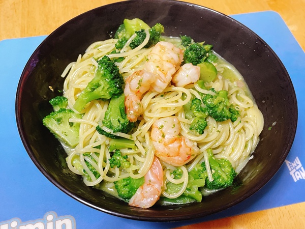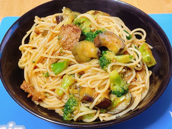 夜ご飯はまた山盛りパスタ。ナスとブロッコリーのミートソース。パスタ…山盛り以外作れない…。