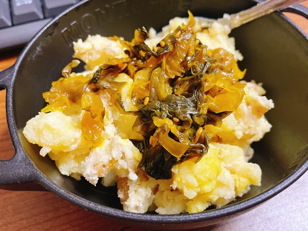 夜ご飯は定番の山盛りパスタ。海老とブロッコリーのジェノベーゼパスタ。家庭菜園のバジル重宝してます。そして夜中に小腹が減ってポテサラに高菜乗せたやつ。最近のお気に入りです(*^^*)