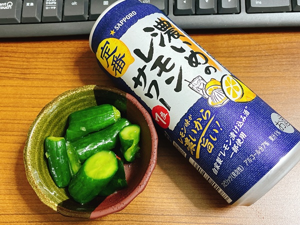 夜ご飯はガパオもどき。最近、目玉焼きをひっくり返そうとして失敗することが多いです…。そして晩酌は濃いめのレモンサワーとたたき胡瓜。夏はきゅうりがうまい。