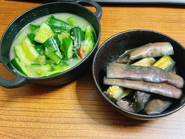 夜ご飯はたたき胡瓜とナスの煮浸し。食後に桃を食べました。夜ご飯は軽めにしたい…