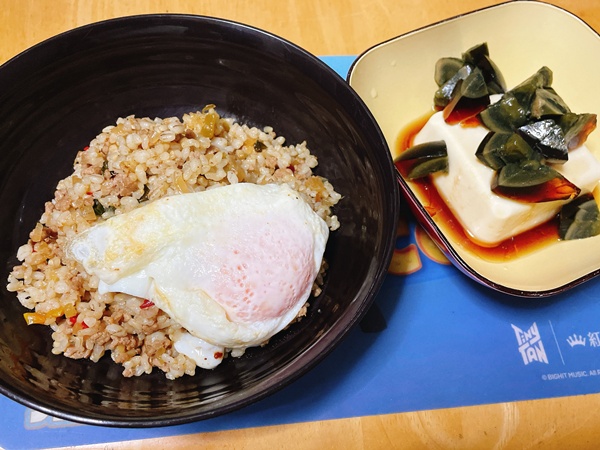 夜ご飯はガパオチャーハンもどきとピータン豆腐です。どちらも美味しかった!美味しいもの食べられるのは幸せだ。