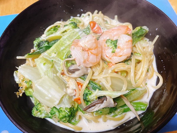 夜ご飯はロメインレタスとキノコ、トマト、海老のミルクパスタ。ロメインレタス火を通しても美味しいのね。