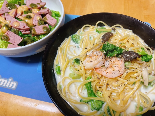 夜ご飯、またまたミルクパスタ。寒いと温かいスープ系を欲します。そしてロメインレタスとボロニアソーセージのサラダ。たまにはサラダを食べるのです。