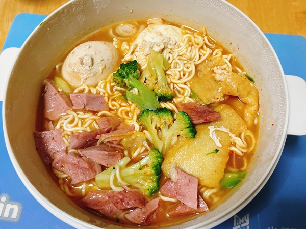 日曜日の夕方ご飯。日曜日、もう何をしていたのかすら忘れていますが夕方にご飯を食べていたみたいです。チャルメラ宮崎辛麺に色々入れました。