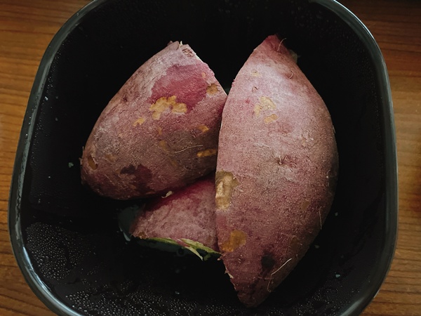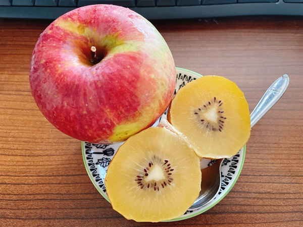 土曜日のお昼はさつまいもとりんごとキウイ。体に優しい食事をこれでやっとスタートさせられるのかという感じ。
