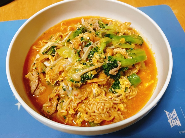夜ご飯はマッサマンカレーのラーメン。これ、美味しくてびっくり!インスタントばっかり食べるのは駄目なんだけど、美味しいとついつい食べてしまう。