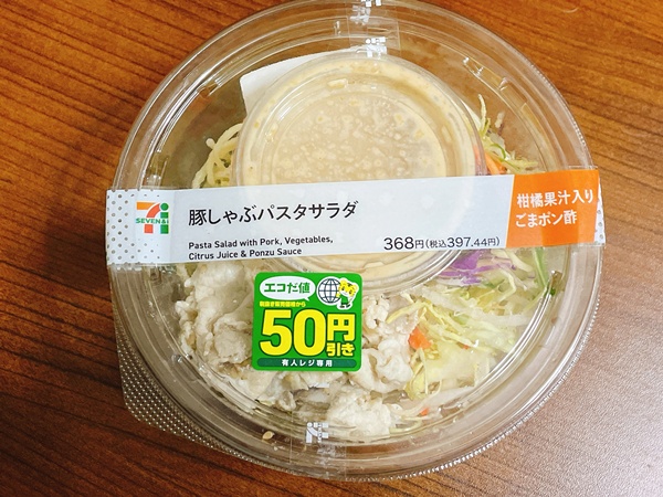 土曜日のお昼はセブンの豚しゃぶパスタサラダ。パスタサラダって、たまに無性に食べたくなるのは何でだろう?