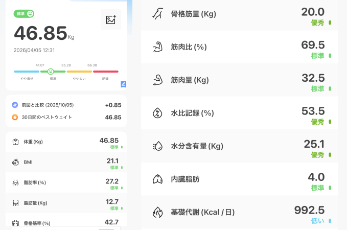 で、体重なんですが…46.85kgでした。冬の間、暴飲暴食して筋トレもモチベ落ちてたので2kgぐらいリバウンドしたんじゃないかと思っていたら、1kgも増えてなかった…ただ筋力は少し落ちているので今後は筋肉を増やして脂肪を減らすのを目標にしたい。
