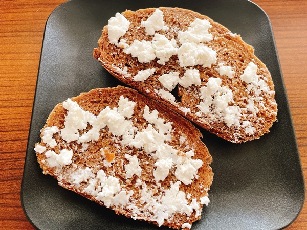 月曜日の朝ごはんとお昼ごはん。少し体調が良くなってきた私。食欲はずっと旺盛です。朝はさつまいも。昼はお手製パンに山羊のチーズ乗せたやつ。最近、お手製パンがいい味で作れるようになったので嬉しい。