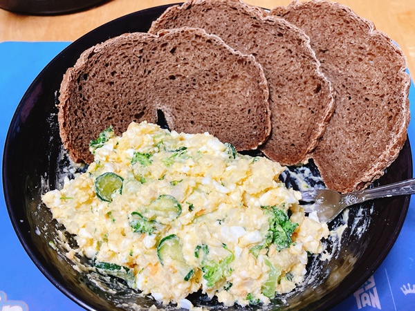 夜ご飯はお手製パンと卵入りのポテサラ。ブロッコリーも入れてます。パンに乗せて食べました。美味しい。