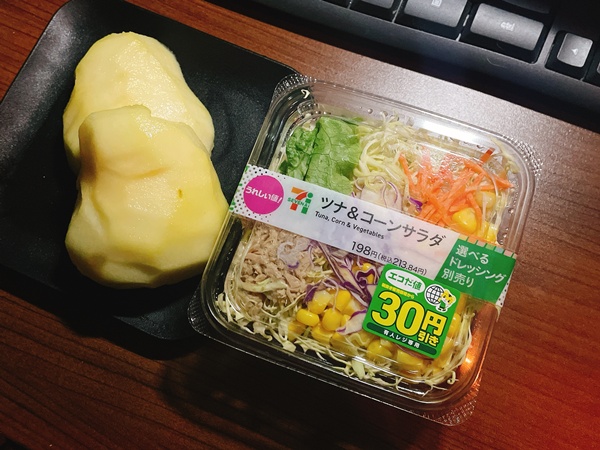 夜ご飯は洋梨とセブンのツナ&コーンサラダ。たまに野菜を食べるのって大事。サラダとかそんなに好まないのだけど体が欲してた。もう少し野菜食べるようにしないとなあ…。